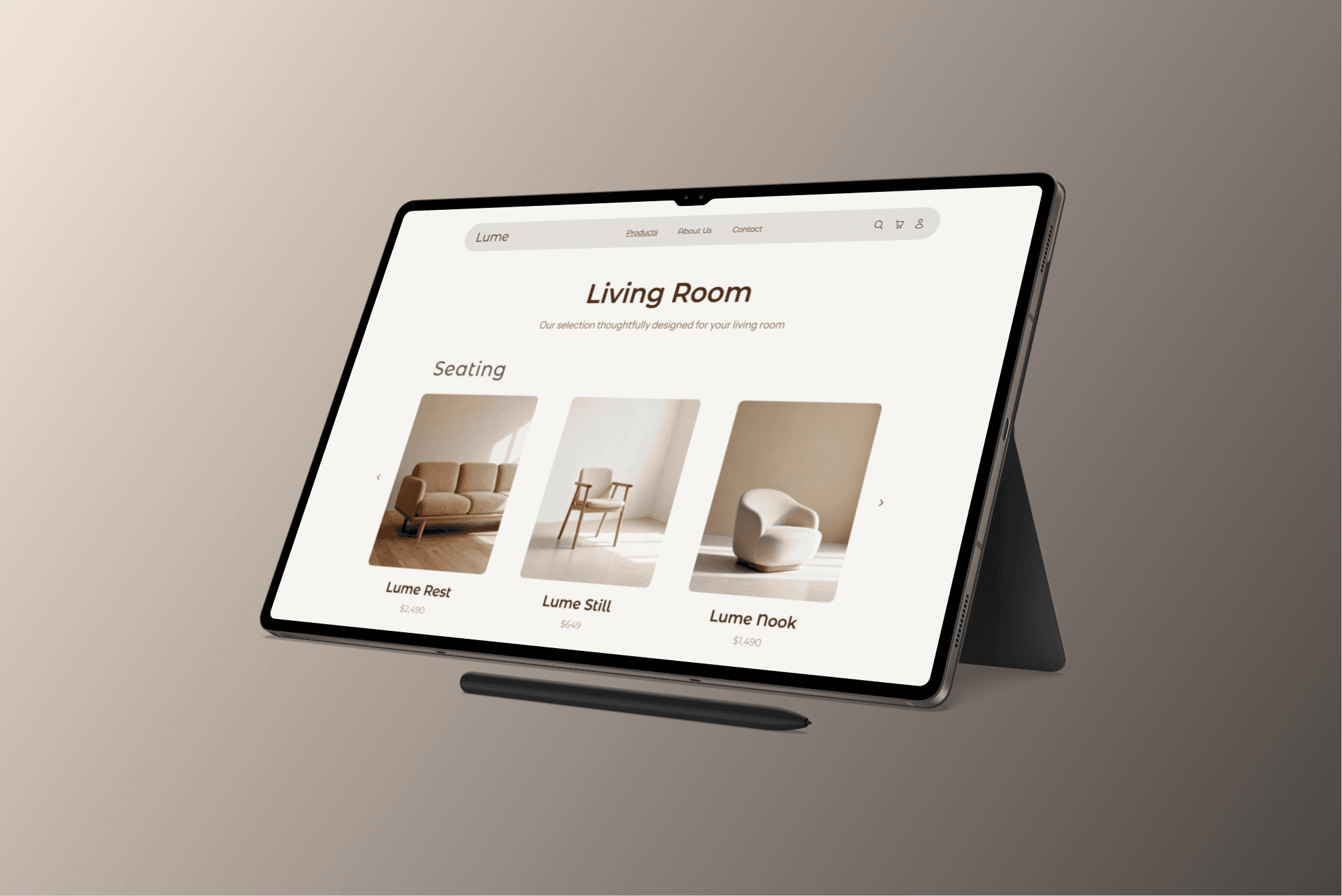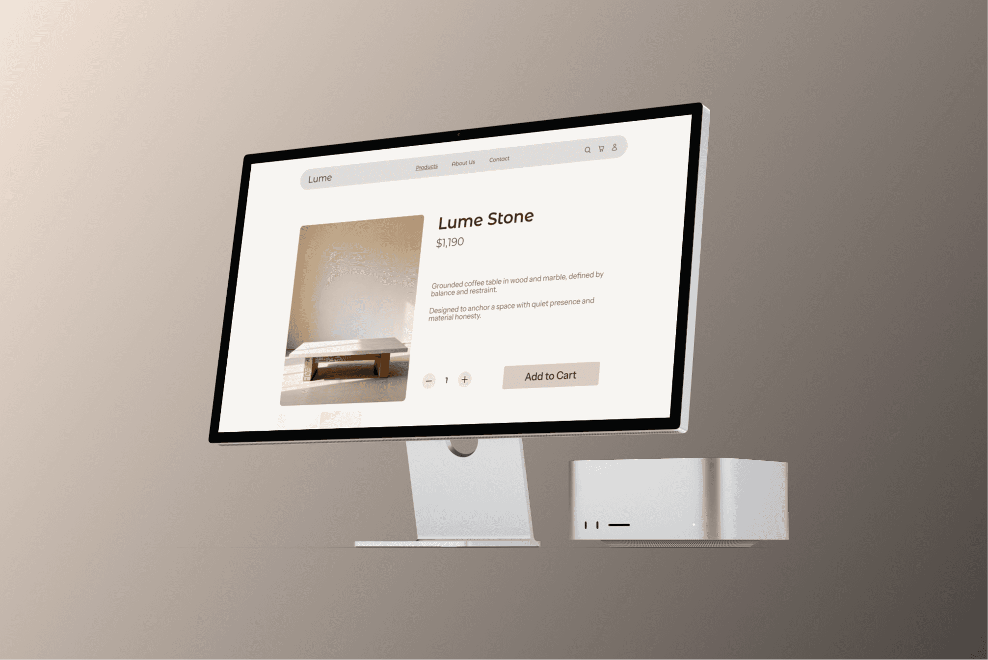 Minimal visual system - warm neutrals, clean typography, generous white space - keeps the focus on the furniture itself rather than the interface around it.