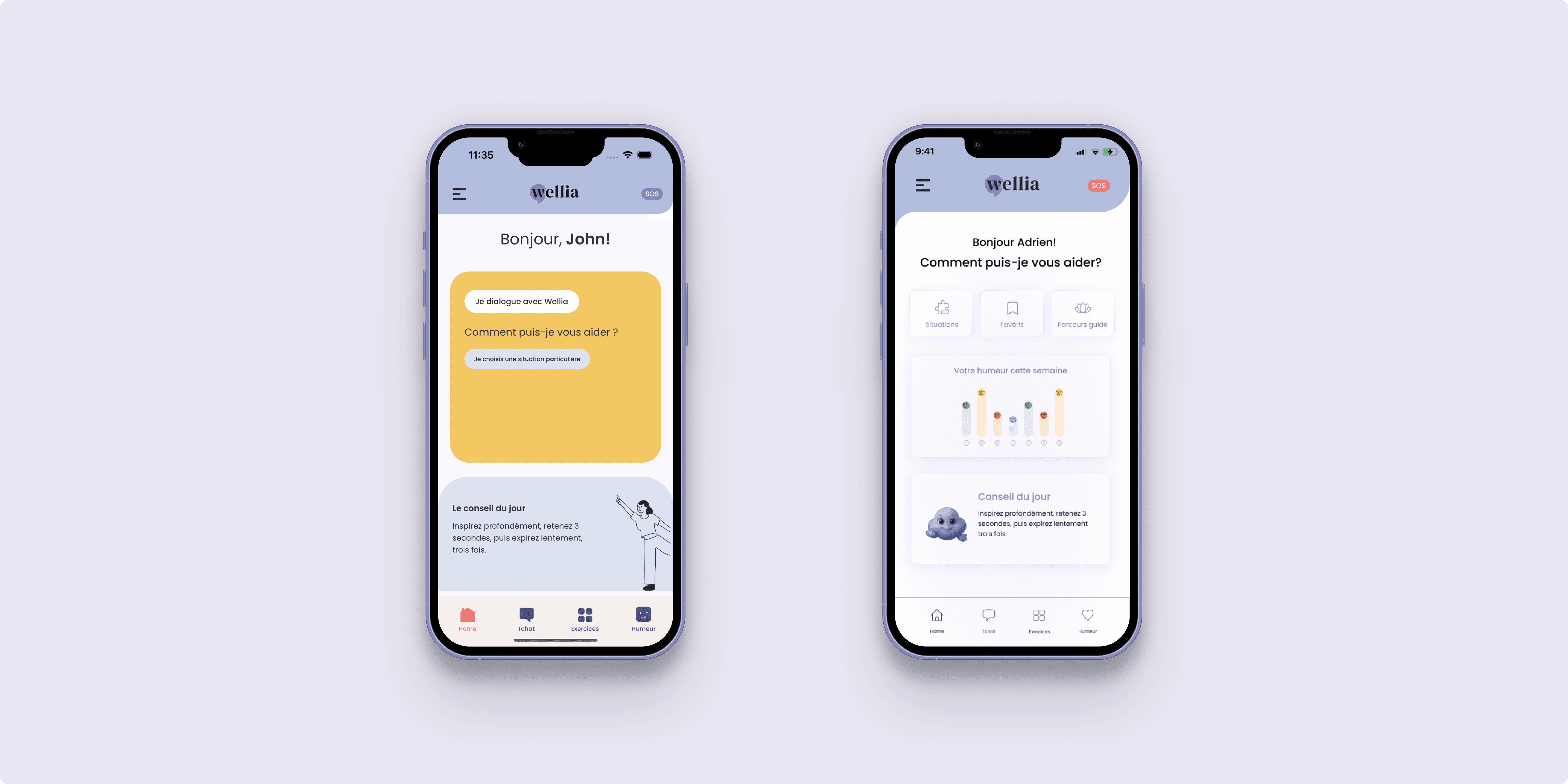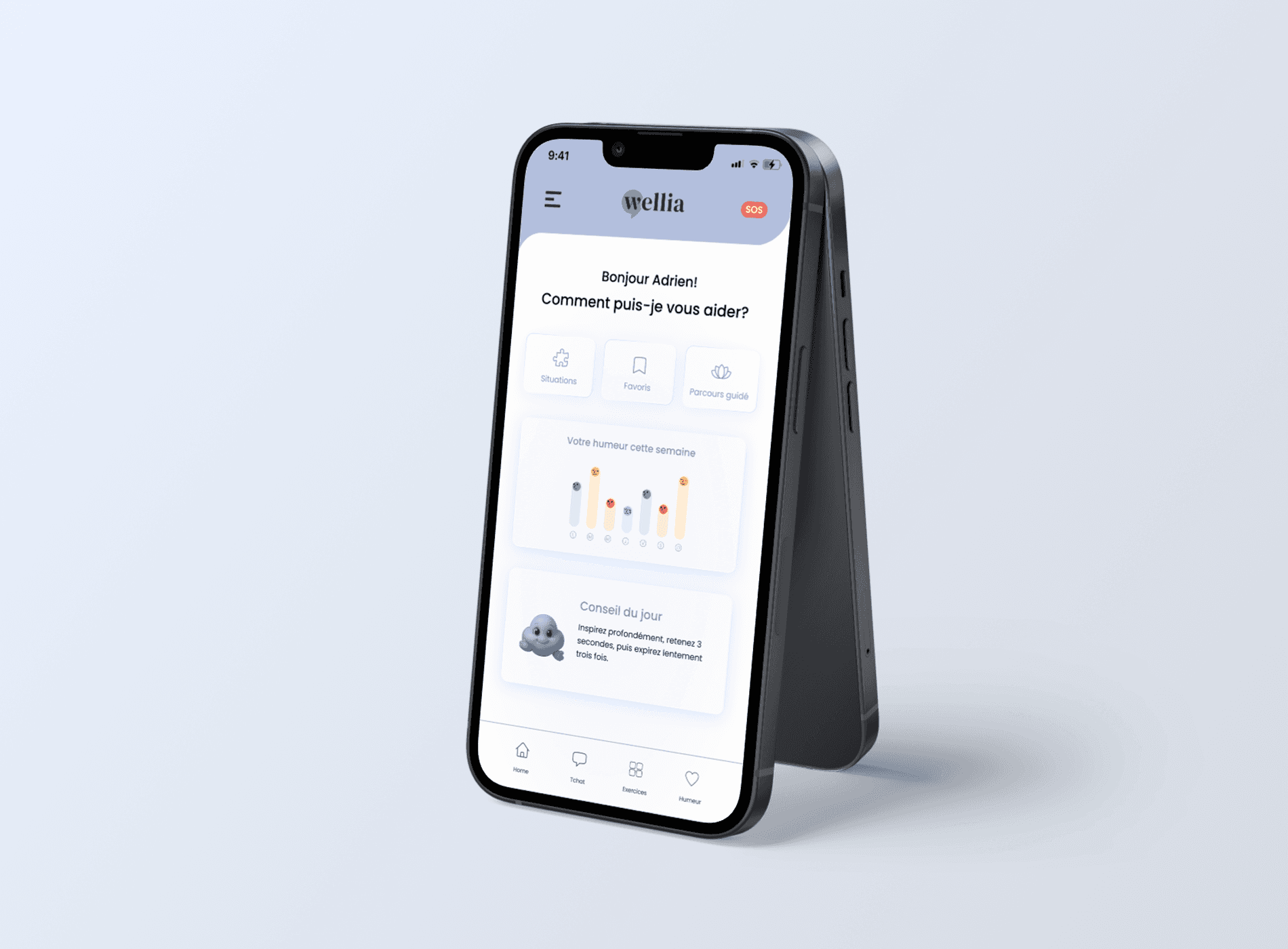 Hierarchy that guides, not overwhelmes. The old homepage lacked a clear visual structure - everything had the same weight, leaving users without orientation or a natural starting point. The redesign establishes a clear priority: a personal greeting, quick shortcuts to key features, a weekly mood chart, and a daily wellness tip. Every element has a reason to be there and a place in the flow.